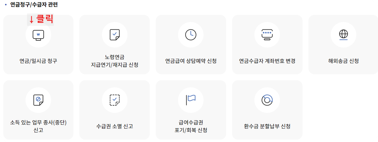 연금/일시금 청구를 신청하기 위해서는 국민연금 홈페이지의 아래 메뉴에서 신청하시면 됩니다.