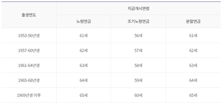국민연금은 국내거주 18세 이상 ~ 60세 미만 국민이면 가입대상이 되며, 최소 가입기간 10년을 채웠을 경우 수급 연령이 되면 노령연금을 받을 수 있습니다. 노령연금을 받는 연령은 1952년생까지는 60세였습니다. 하지만 고령화 추세를 반영하여 1953~1956년생은 61세, 1957~1960년생은 62세, 1961~1964년생은 63세, 1965~1968년생은 64세, 그리고 1969년생 이후 출생자는 65세부터 노령연금을 수령하도록 1998년 말에 법이 개정되었습니다.