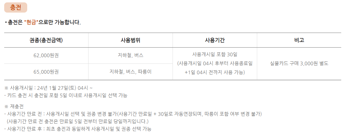 충전은 현금만 가능하다는 점 꼭 유의해주세요. 또한 실물카드 구매 비용 3,000원은 별도입니다.
