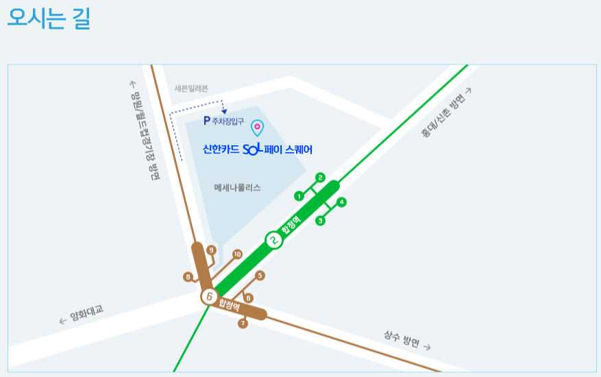 | 위치 | 서울특별시 마포구 양화로 45 메세나폴리스 2층 신한카드 SOL페이 스퀘어 (우: 04036) |