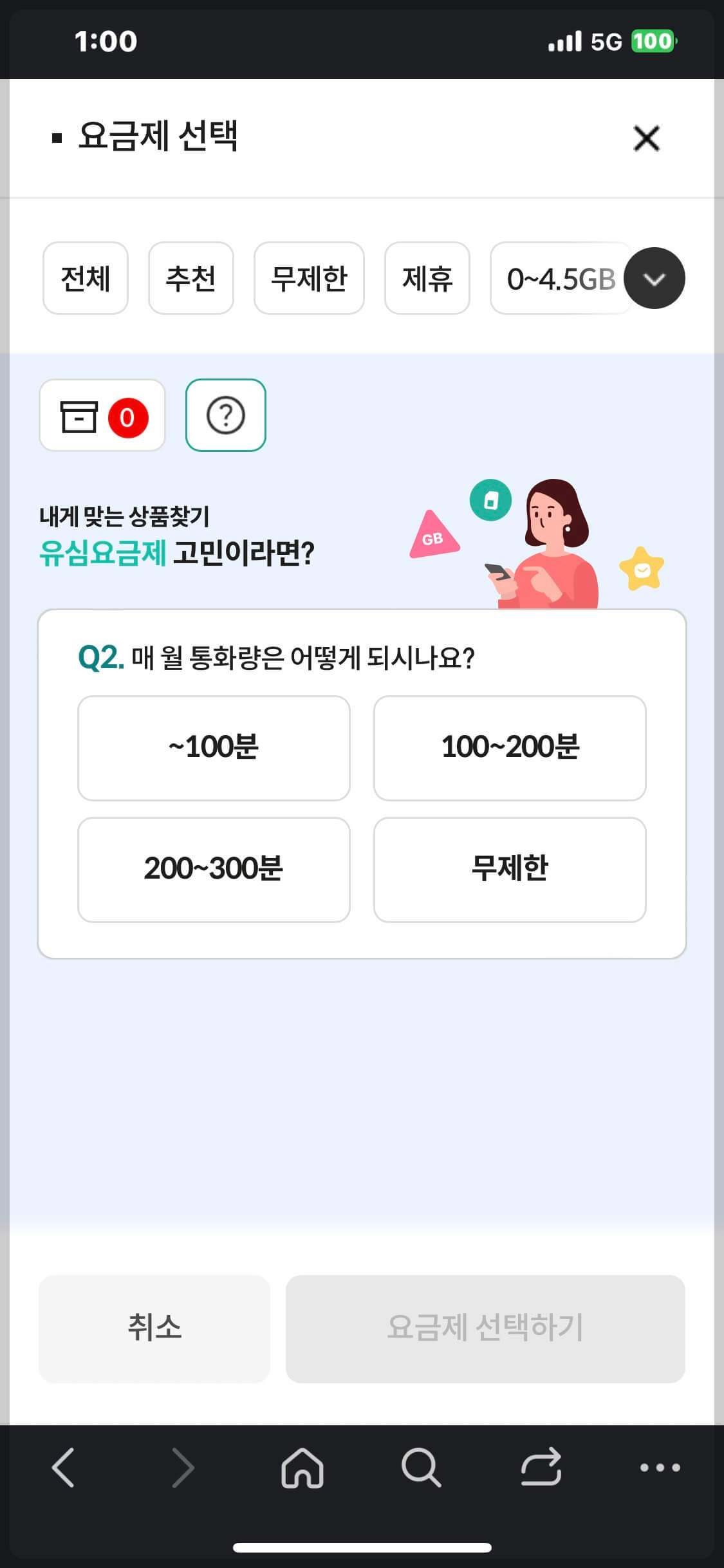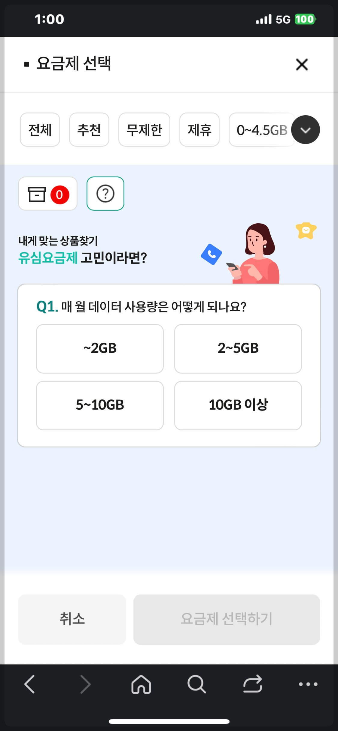 4. 물음표를 누르면 데이터 사용량과, 통화량을 선택하여 조건에 맞는 요금제를 볼 수 있습니다.