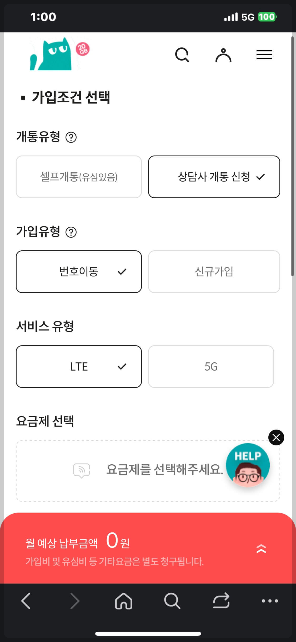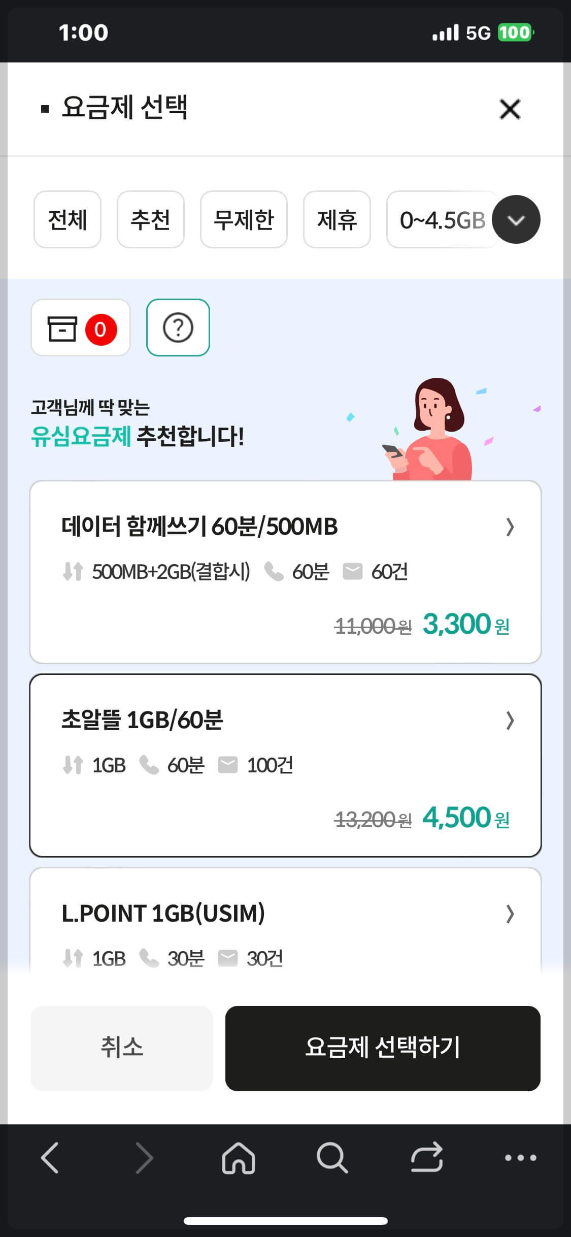 3. 요금제 선택란을 누르면 요금제 선택 화면으로 전환됩니다.
