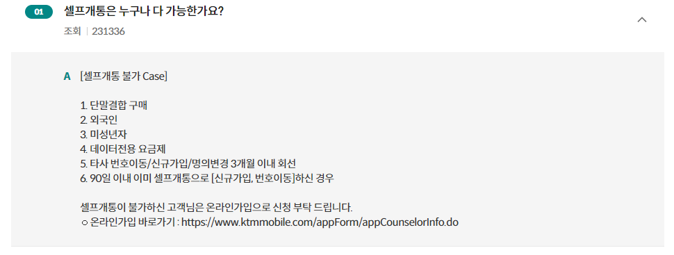 아래 설명은 어떤 알뜰폰 사업자나 동일합니다. 알뜰폰 가입 시 미성년자 및 외국인인 경우는 상담사 연결을 통해 가입이 가능합니다. 그 외 내국인인 경우는 셀프개통이 가능합니다. 아래에 해당하는 분은 셀프개통이 불가하니 꼭 확인하세요! 또한 셀프 개통 가능한 시간은 <번호이동> 오전 10시~오후 7시, <신규가입> 오전 8시~오후 7시까지 가능합니다. 통신사향 단말기와 상관없이 알뜰폰 개통방법은 동일합니다.
