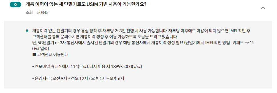 제가 개통이력이 없는 통신사향 단말기에 알뜰폰 신규가입을 통해 유심개통을 진행했는데, 유심개통은 되었지만 새 단말기에서 개통완료된 유심 인식이 안되는 현상이 발생했습니다. 이런 경우에는 고객센터 상담원을 통해 확정기변을 요청해야 합니다! 아래(이미지)의 케이스였습니다. 해당 단말기의 IMEI를 상담원에게 알려주고, 명의자가 미성년자인 경우 법정대리인 신분증을 해당 상담사에게 전송해주면 바로 처리해줍니다. IMEI 번호 확인 방법은 새 단말기 키패드에 *#06#(별샵영육샵)을 누르면 바로 확인 가능합니다. 상담사 통화 및 필요서류(없을 수도 있음) 전송 후 10분 이내에 개통 완료된 것을 확인할 수 있습니다.