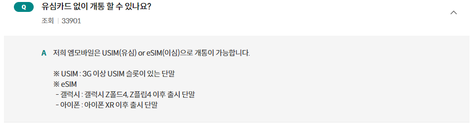 eSIM : 휴대폰에 내장되어 있는 유심칩입니다. 내장 유심칩으로 개통하기 때문에 별도의 유심을 준비할 필요가 없습니다. eSIM 지원 폰인지 확인하는 방법은 *#06# (별샵공육샵) 후 통화버튼을 누르면 기기정보가 나타나는데 IMEI 번호 바코드, IMEI2 번호 바코드가 나온다면 eSIM지원폰입니다.