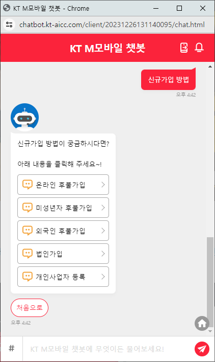 1. 챗봇 HELP 버튼(우측 아래 안경쓴 HELP 아저씨)을 누르면 첫번째 그림처럼 나옵니다. 미성년자 후불가입을 누르고