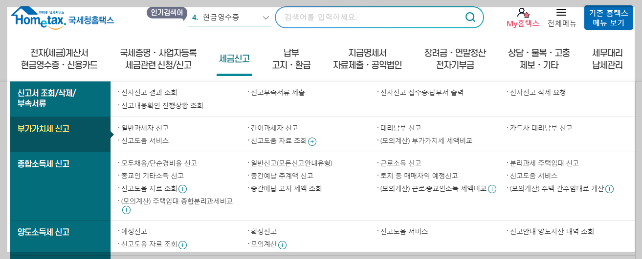 위와 같이 여러 방법 중 홈택스에서 신고하는 방법을 설명드릴게요. 시간도 덜 걸리고, 간편하기 때문입니다. 홈택스와 손택스를 통해 신고하면 전자세금계산서 매출‧매입 내역과 신용카드 매출 내역, 현금영수증 매출‧매입 내역, 사업용 신용카드 매입 내역 등을 자동으로 불러올 수 있습니다.