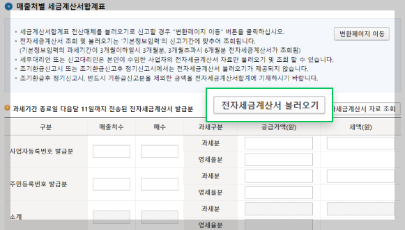 [매출처별 세금계산서 합계표] 신고 화면이 나오는데, 전자세금계산서를 발급한 매출 내역은 [전자세금계산서 불러오기] 버튼을 클릭하시면 매출처수, 발급 매수, 공급가액, 세액이 모두 자동으로 입력됩니다.