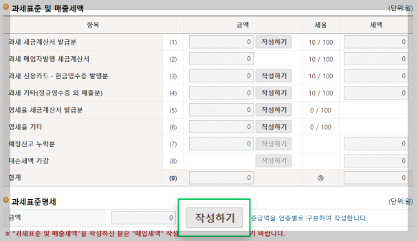매출 내역을 입력하셨다면 [과세표준명세]도 이어서 작성해주셔야 합니다. [작성하기] 버튼을 클릭하여 앞서 신고한 매출금액을 사업체 업종별로 나눠서 입력하는 방식으로 작성하시면 됩니다. 사업자등록증에 주업종, 부업종이 등록되어 있고 주업종과 부업종 모두 매출이 발생했다면 매출금액을 주업종과 부업종별로 각각 나눠서 입력하셔야 합니다.