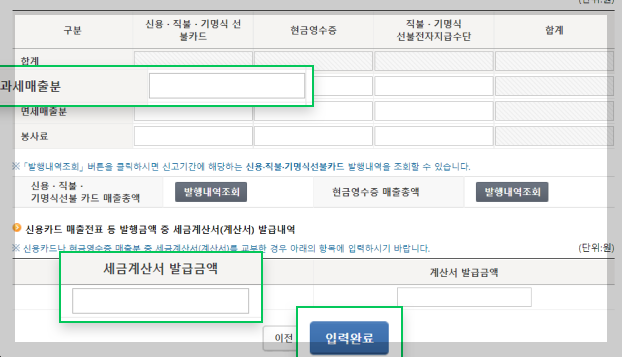 종이 세금계산서로 발급한 매출 내역은 자동으로 불러올 수 없기 때문에 종이 세금계산서를 발급한 매출이 있을 경우 직접 입력해줍니다. 매출처 사업자등록번호 및 세금계산서 발급 매수, 공급가액, 세액을 넣어줍니다. 입력한 종이 세금계산서 매출 내역은 상단의 [종이세금계산서와 전송기간 마감일이 지난 전자세금계산서 발급분 등] 항목에 내용이 자동 집계됩니다. 매출 세금계산서를 모두 입력했는지 다시 확인한 뒤 하단의 [입력완료] 버튼을 클릭합니다.