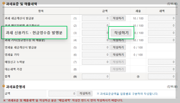 신용카드와 현금으로 결제받은 매출을 입력하기 위해 [과세 신용카드‧현금영수증 발행분] 항목 옆에 있는 [작성하기] 버튼을 클릭합니다.