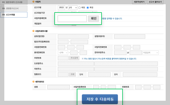[사업자등록번호] 항목에서 사업자등록번호를 입력하신 후 [확인] 버튼을 누르면 사업체 세부 정보가 자동으로 불러와집니다. 세부 정보를 입력한 뒤에 [저장 후 다음 이동] 버튼을 클릭합니다.