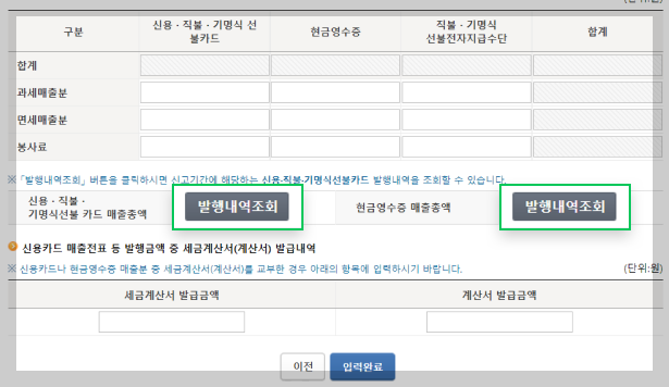 화면 하단에 [발행내역조회] 버튼들을 누르시면 각각 신용‧직불‧선불카드 결제받은 매출 내역, 현금을 받은 뒤 현금영수증을 발행한 매출 내역을 확인할 수 있습니다.