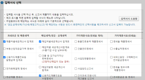만약 이번 과세기간에 매출‧매입 실적이 없다면 [무실적 신고] 버튼을 누르셔서 무실적 신고를 진행하시면 됩니다. 다음에 나오는 [입력서식 선택] 페이지에서는 부가세 신고 시 제출할 서류를 선택합니다. 업종에 따라 요구되는 서류를 제출하지 않거나 제대로 작성하지 않을 경우 가산세가 부과될 수 있습니다. 주업종, 부업종 모두 체크하셔야 합니다. 신고 전에 국세청 안내 동영상을 먼저 시청하셔서 업종별로 신고해야 하는 서류들에 대해서도 꼭 알아두시기 바랍니다. [저장 후 다음이동] 버튼을 클릭합니다.