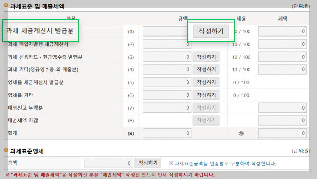 세금계산서를 발급한 매출 내역이 있는 경우 [과세 세금계산서 발급분] 항목 옆에 있는 [작성하기] 버튼을 클릭하시고