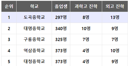 강남구에는 무려 12개의 중학교가 상위 10% 내에 포함되어 있습니다. 과거 자료라 하더라도 학군 좋은 곳은 지속적으로 유입이 있기 때문에 상위 학교들의 큰 변동은 없을 거라 추측됩니다.