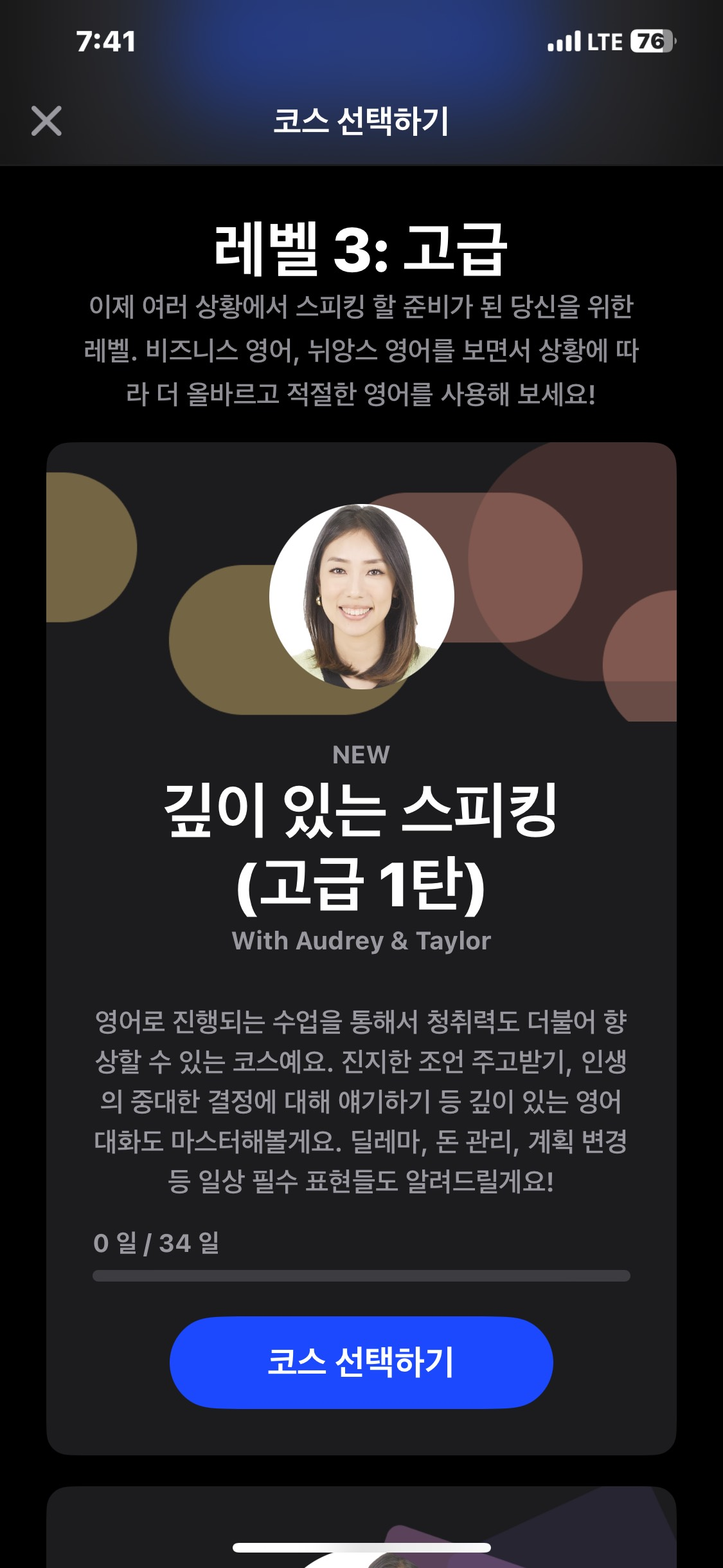 최근에는 레벨3 고급 단계에서 <깊이 있는 스피킹(고급1탄/2탄)> 2개 코스가 추가로 업데이트 되었어요! 영어 뉘앙스를 살려서 깊이 있는 대화를 할 수 있도록 표현을 배웁니다. 또한 회사에서 사용할 수 있는 비즈니스 영어와 면접을 위한 영어 코스도 준비되어 있어요.