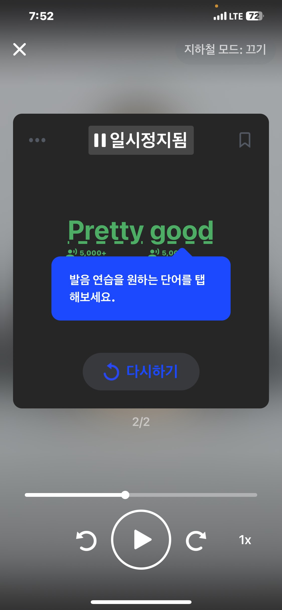 - 그리고 기본 문장을 들려주고, 마이크를 통해 문장 발화를 인식해서 아래처럼 초록색으로 표시해줘요.