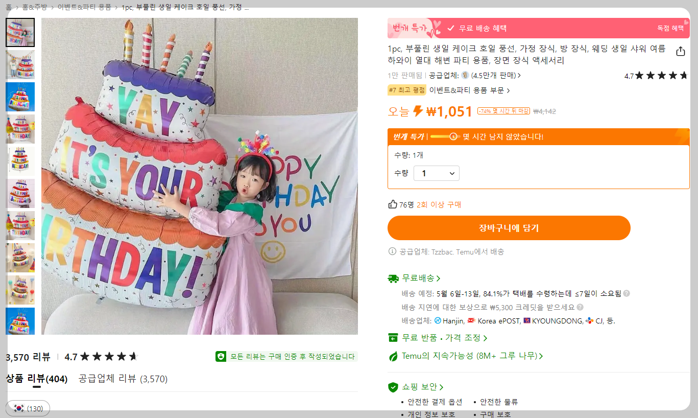 아래 제품같은 경우는 아이 생일 전에 미리 준비해 두면 좋을 것 같습니다. 동일한 제품인데 테무는 800원 ~ 1천원 대, 쿠팡은 6천원 후반대 입니다. 가격면에서는 테무가 압승이네요. 어차피 쿠팡이든 다른 쇼핑몰이든 테무이든 거의 모든 제품들의 중국에서 생산되기 때문에 가격이냐 배송이냐에서 선택할 문제인 것 같습니다.