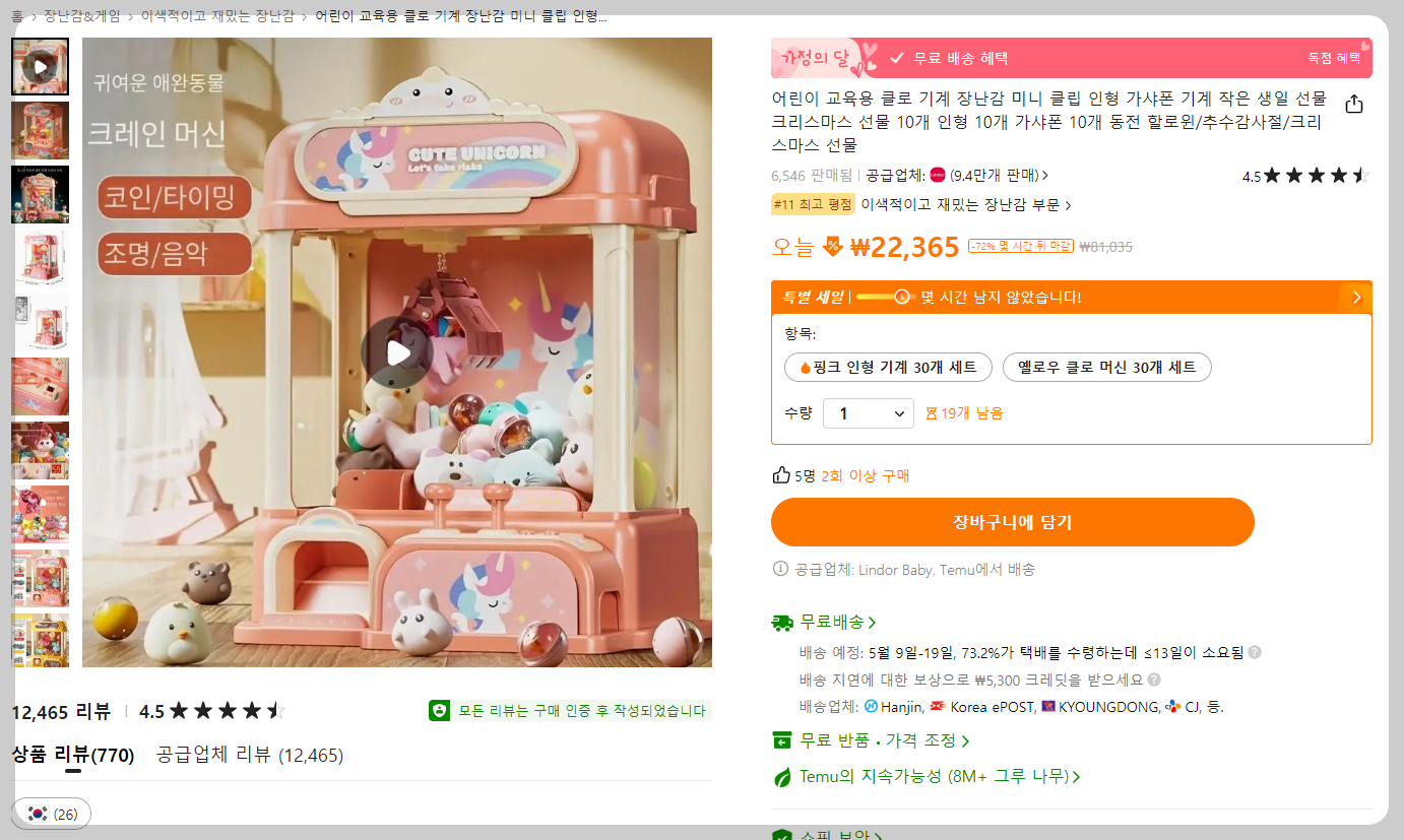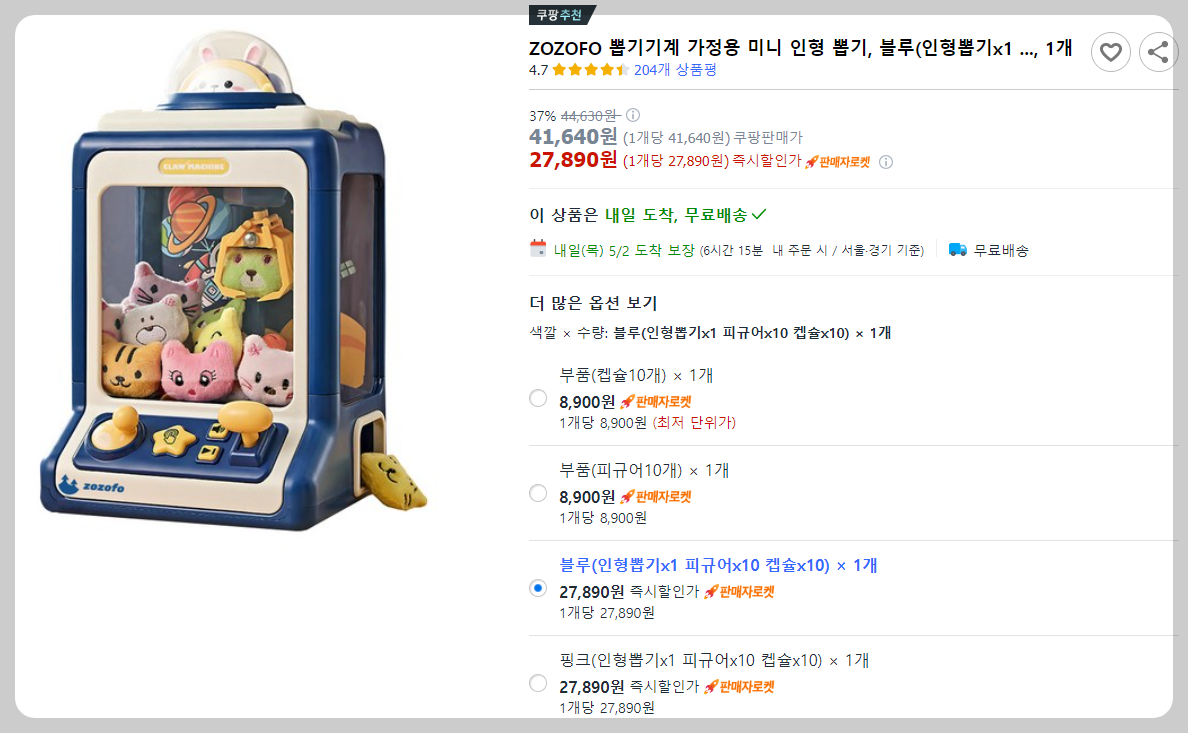 오늘이 5월 1일인데요. 보시면, 5월 9일~19일에 배송이 된다고 써 있습니다. 배송기간은 기본적으로 최소 2주가 소요되는거죠. 마음에 드는 제품을 미리 주문했으면 싸게 살 수도 있지만 지금 이제서야 어린이날 선물을 검색해보는 우리는 이미 늦었잖아요? 그러니까 테무에서 구경하고, 다른 쇼핑몰에서 구입하면 됩니다. 아래는 쿠팡에서 비슷한 제품을 찾은거예요. 내일이면 도착한다니까 마음이 놓이죠. (물론 어떤 제품이 더 좋은지는 두 제품을 갖다놓고 비교하기 전에는 알 수 없습니다. )